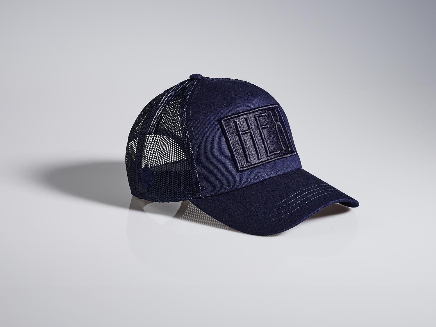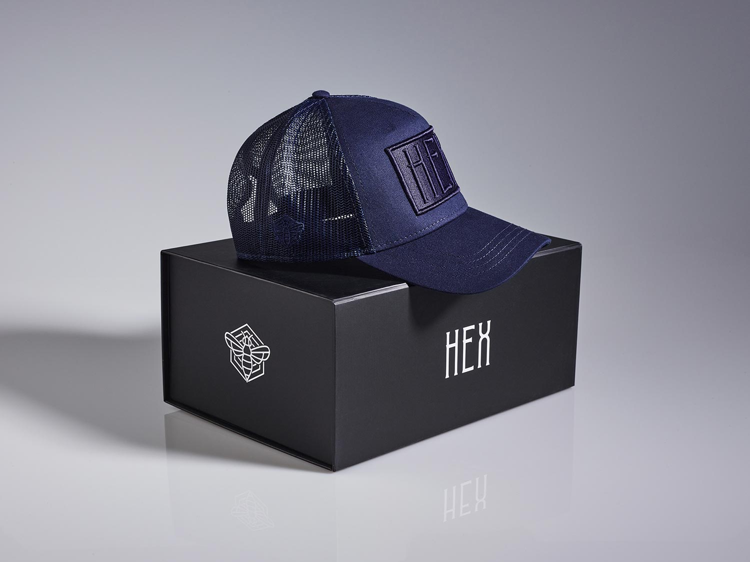 The triple midnight navy trucker cap is manufactured in Manchester of premium cotton and features hand-embroidered HEX logo design in midnight navy. It also comes with the Worker Bee emblem positioned neatly into the side panel in midnight navy and breathable mesh panelling on the rear.